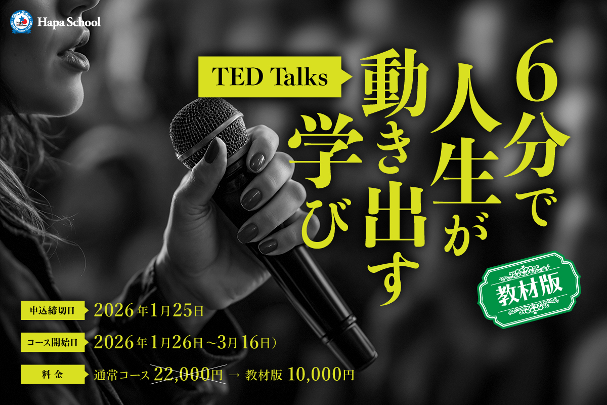 みなさん、こんにちは。Hapa Schoolへようこそ!ロサンゼルスのレストランで食事をしている最中、隣のテーブルのアメリカ人が、大好きなテレビ番組や音楽など、様々な話題で会話が盛り上がっいるシーンを想像してみてください・・・それが、まさにHapa Schoolで学べる内容なんです。私は昔から、英会話を習得するのに最も効果的な方法は、リアルな会話から学ぶことだと信じています。アメリカ人のリアルな日常会話を、何のフィルターも通さず学んでこそ、ネイティブ特有のナチュラルな表現を習得することができます。円滑なコミュニケーションをとるには、教科書通りの“正しい英語”だけではなく、形式に捉われない“口語的な英語”をマスターする必要もあります。さぁ、アメリカ人のリアルな日常会話に飛び込み、ネイティブとの会話を思いっきり楽しんでください!